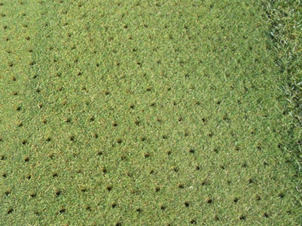 首先,打孔有助于使水分更快地渗入土壤。草坪在果岭表面形成致密的冠层,同时表面的枯草层会阻碍水分进入土壤。而且随着土壤板结的加剧,水分更是难以进入。严重时会形成“干斑”,这种干斑无论怎么浇水都无法渗透到土壤中去。有时草坪总监们使用渗透剂来对付干斑,当然渗透剂也很有效,但是打孔最经济有效。打孔针直接穿透草皮和枯草层,形成一个水分进入土壤的通道。同时也为氧气的进入创造条件,植物根系需要呼吸足够的氧气才能保证植物正常的生理代谢。